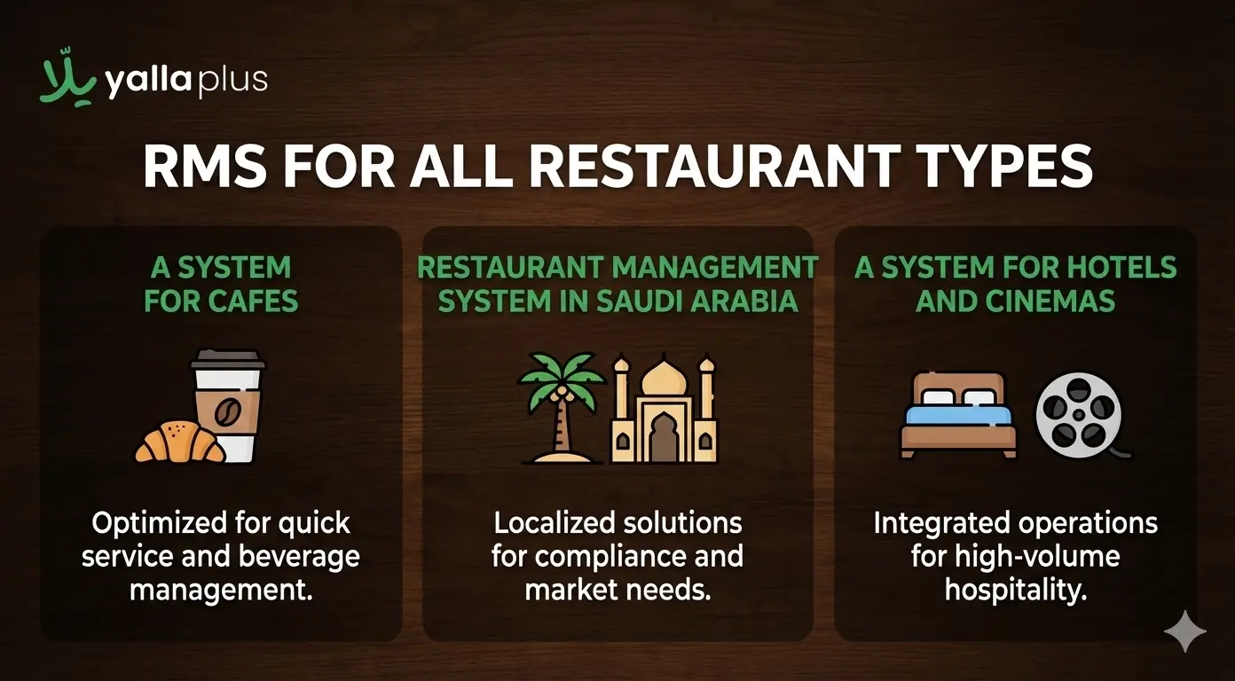 The Saudi market is diverse; we have modern cafés in Riyadh, family restaurants in Jeddah, luxury hotels, and even cinemas that offer food service, each with its own specific needs. The good news is that a system like Yalla Plus is designed to support this variety in the following way:
